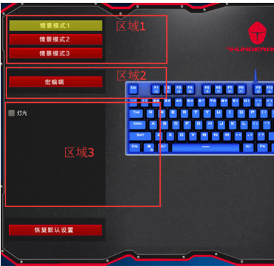 【区域1】有三种情景模式,可以保存三个对键盘灯光、宏的设置,方便切换