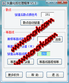 CAD地形图矢量化后处理程序采用基于AutoCAD的VBA编写,能够对已经矢量化的地形图中的散点、等高线进行快速赋值。免费软件,无任何功能和时间上的限制。