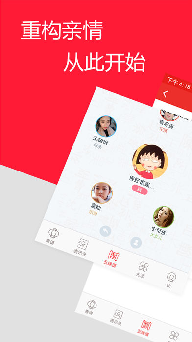 “靠谱e家”能层次分明、深度地将亲人集聚。一度关系以我为中心,有“我”、父母、夫妻、兄弟姐妹、子女五缘关系,二度以“我”为中心,延伸一度中的直系亲人,三度以“我”为中心延伸二度的直系亲人,四度以此类推。