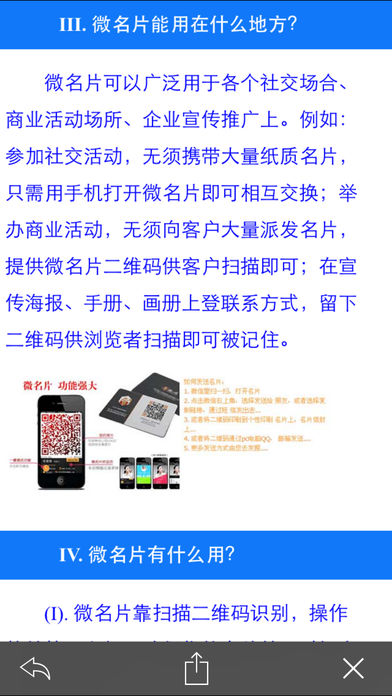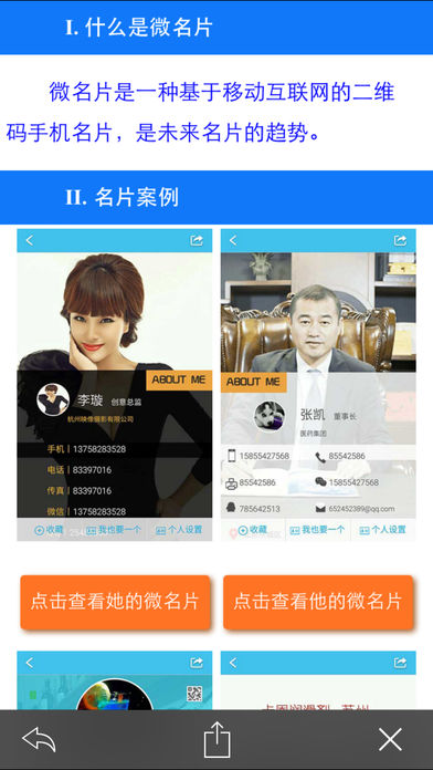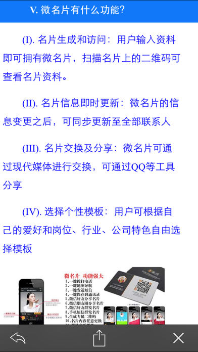 加入多媒体元素,图文声像并茂达到全方位宣传效果携带方便,可以使用手机转发,可以随时更新,由于是电子文档的格式,可以随时修改增删宣传内容,成本低,制作微名片,多媒体名片,微商微信所属名片功能,可以随用随做,无需最小订货量,减少资源浪费,客户索取样本,无需通过快递邮寄,转发其微名片就可以,展示企业创新意识,突出企业形象,设计精美,有交互菜单,在复杂的内容也会变得层次分明,浏览简单。