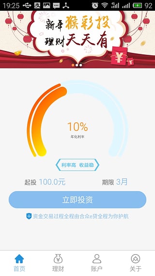 合众e贷理财APP,互联网手机移动端金融投资理财工具,综合可信赖的投资理财平台。起投门槛低,周期灵活,收益稳。百万风险准备金护您资金安全。