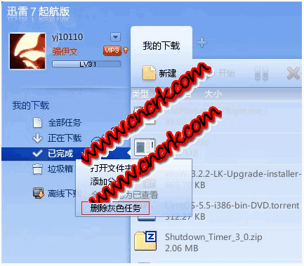 迅雷7插件批量删除灰色任务 简体中文绿色免费版 灰色任务:是指迅雷7任务列表中,因本地文件被“删除、移动”导致无法找到对应文件的已完成任务。这些任务在任务列表中,任务文字以灰色标识。因此称为“灰色任务”