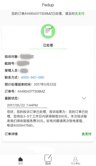 Fedup收到用户的申诉内容后,经过Fedup与航空公司的交涉,会反馈给用户的最终处理结果,面对投诉事情不会再不了了之。