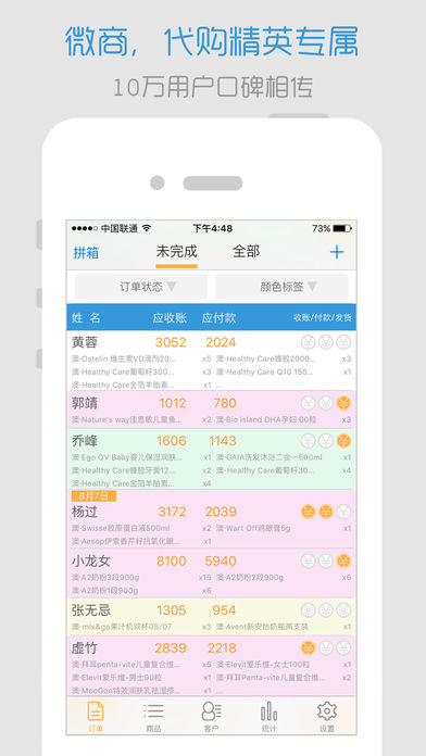 倒爷是网上做生意必备的记账软件,帮你管理订单、客户、代理、商品,统计利润,追踪物流。非常适合微商、代购等在微信朋友圈卖东西,以及线下开小店的朋友。我自己就是一个混迹于朋友圈的小卖家,经常搞不清楚每笔订单有没有收到货款,有没有给上家付款,有没有发货。别人问我每件商品的售价或者代理价,也容易搞混了。所以任性一把,与老公一起开发了这个倒爷App。【软件特点】