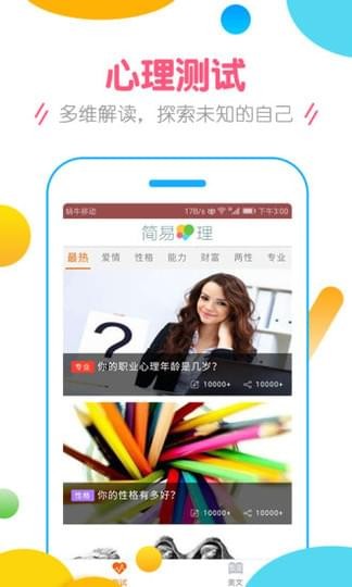 简易心理APP是一款简单有趣的测试类APP。在简易心理,我们为用户提供全方位的心理沙龙。包括性格测试、职场测试、情感测试、婚姻测试、健康测试、人际交往测试、能力测试、情绪测试、金钱测试、智商测试等。简易心理带你探索真实的内心世界。
