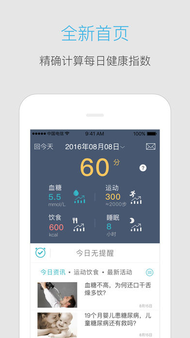 【不一样的首页】我们通过实时分析您的综合健康数据(血糖,饮食,运动,睡眠等),系统会计算出您当前的健康指数,大部分数据系统都会自动采集,瞄一眼就能知道当前的健康状态,是不是很酷炫!!!
