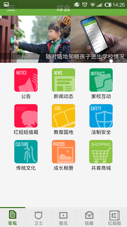 成长论坛:论坛学习交流;校园卫士:接收接送卡信息;