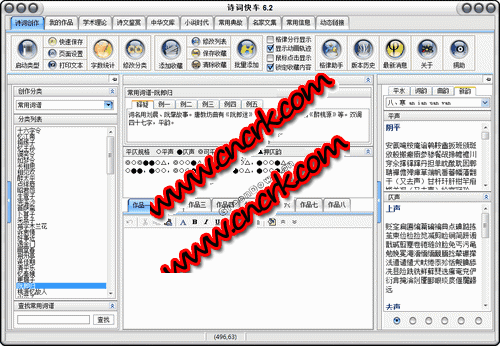诗词快车是来自填词大亨的升级版本,是专业的写诗填词的软件,提供了丰富的对联、绝句、律诗、词谱和曲谱的格律规格及范例。并可根据需要自行在收藏栏目中添加或修改新格律。另有平水韵、词韵、曲韵、新韵四种不同方式的押韵模式供诗词爱好者选择。
