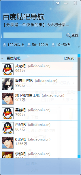 百度贴吧导航是一款专为百度贴吧的管理者们所提供的贴吧管理工具。该工具可以根据用户提供的关键词快速查找上万个贴吧内容,速度快、效率高、便于管理。