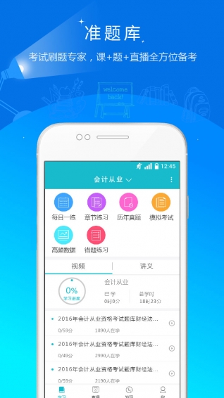会计从业准题库app是一款备考会计从业资格考试的神器,如果您想迅速取得会计从业资格证(会计证),那么一定不能错过这款专为会计从业资格考试设计的手机题库软件。会计从业准题库app设计风格清新,时尚。集《财经法规与会计职业道德》、《会计基础》、《初级会计电算化》2016年考纲最新万题库、各章节专项练习、错题解析、每日竞赛、会计名师直播,会计考试课程表等功能于一身。