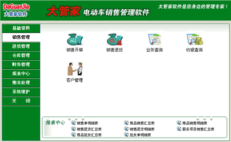 大管家电动车销售管理软件是一款专业针对电动车销售行业的管理软件,适合电动车销售单位进行高效精确管理。功能包含进货、销售出货、仓库库存管理、统计报表管理、财务管理、收入支出管理等子模块。【功能介绍】