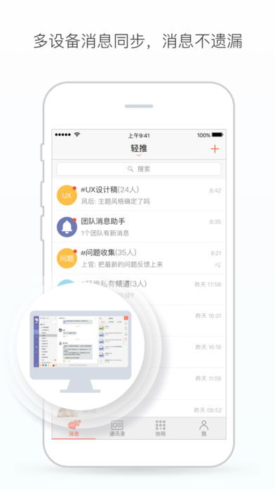 轻推,为你定制的移动办公创新平台,沟通、分享、协作汇聚一处,连接各种工具、系统和服务。因为便捷所以高效,因为高效所以简单。轻推,工作就是简单。【功能介绍】