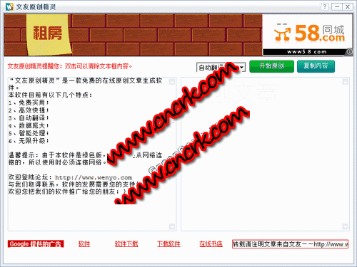 文友原创精灵“”是一款免费的在线原创文章生成软件。本软件目前有以下几个特点: 1、免费实用; 2、高效快捷; 3、自动翻译; 4、数据庞大; 5、智能处理; 6、无限升级; 温馨提示:由于本软件是绿色版,数据库是从网络连接的,所以使用时必须连接网络。