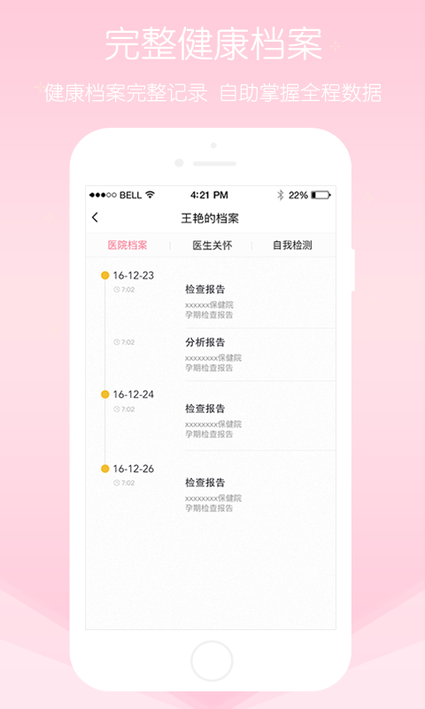 您不用再排长长的队去挂号,不用再在楼道走廊等候数小时领取检验检查报告,也不用再对不知道的症状无人可问时而坐立不安。现在您只需要轻轻滑动手指,预约、候诊、导诊、检查报告一览无余,无需再排队等待;轻轻触动屏幕,营养、保健、康复、家庭医生全程关怀,不再茫然无措。慧孕育app和全国5000多家医院深度合作,汇聚了健康大数据和绿色就诊通道的丰富资源。