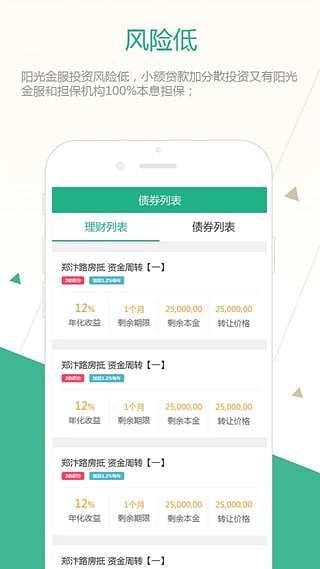 4、安全保障——设置100万以上垫付准备金账户,一旦发生逾期,阳光金服将在第一时间执行垫付程序,垫付时间为还款当天24:00前,为投资者提供100%本息保障;