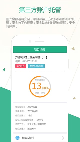 5、资金透明——阳光金服与第三方乾多多合作账户托管,实现平台与资金分离,投资人进行投资需实名认证,提现实行“账户所有人与提现银行卡一致”原则,保证资金不外流;