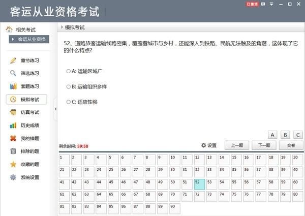 客运从业资格考试是一款优秀的客运从业资格考试系统软件,客运从业资格考试是针对客运从业资格考试过程精心设计的一套功能全面、性能优异,操作简洁的助考软件,有需要的赶快下载吧!【软件特点】