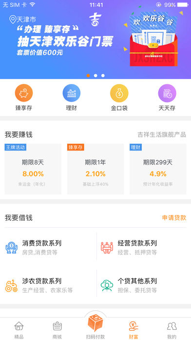 吉祥生活是天津农商银行旗下生活服务平台。吉祥生活内置天津农商银行“吉祥钱包”,为客户提供手充话费、有线电视缴费、网络购电、收付款等常用生活缴费功能。吉祥生活还为客户提供周边天津农商银行网点、自助银行、便民付ATM的查询服务、优农乐选网上商城在线选购等。吉祥生活作为您的移动生活管家,节省您的时间,方便您的生活,令您感受一站式生活服务。