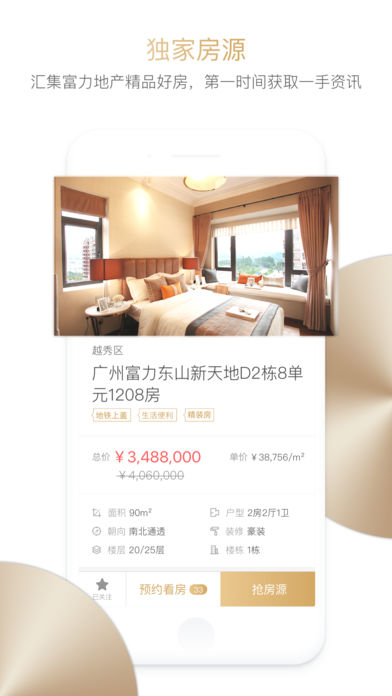 富力好房APP中针对每个用户的需求,直接推荐最优房源,让消费者从大海捞针变为定点撒网有效节省查找房源的时间。同时预约看房和线上支付的功能也最大程度的省去了购房过程中的不必要时间损耗,提供最高效的购房快车道。