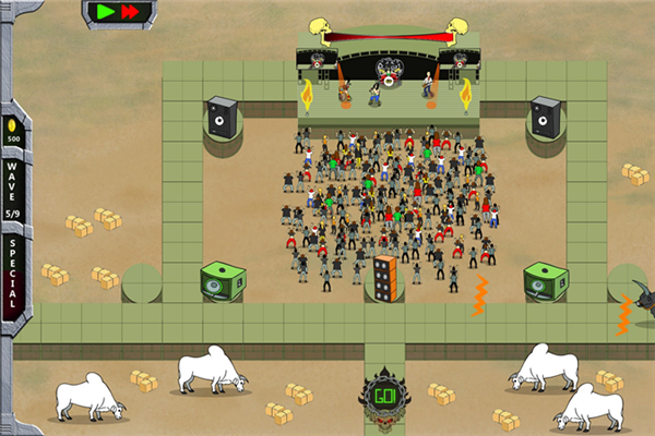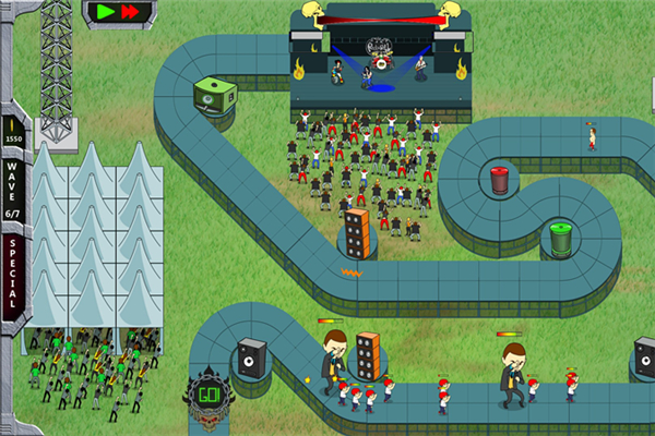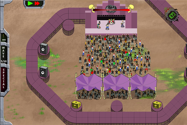 《摇滚塔防(Rock 'N' Roll Defense)》是NukGames制作发行的一款塔防游戏。这款游戏以塔防的形式阻止任何想要破坏摇滚音乐的人,选择劲爆的歌曲,放置好你的乐器设备,一起开始摇滚吧!【游戏特色】
