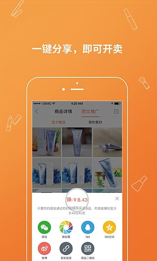 1、一键多渠道分享商品,图文推广更直观~2、买卖皆由你定,卖货赚毛爷爷,买货省毛爷爷。