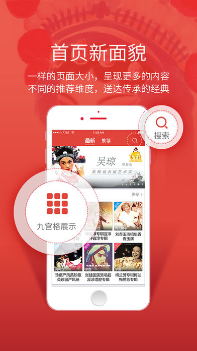 首页上是定时更换的推荐内容,包括著名选段、大师纪念、推荐专辑、推荐戏曲、推荐艺术家等,应用另外有按照唱腔和艺术家分类的列表,总共包含京剧、豫剧、黄梅戏、评剧、川剧等全国 50 多种戏曲唱腔,每种唱腔还有代表艺术家,总共超过 10 万个正版戏曲曲目供戏迷们欣赏。
