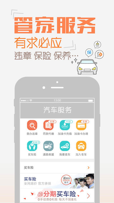 免费提供罚单代缴业务支持,让车主不用再跑银行缴费卡。及时查询,主动提醒汽车车主;加油卡在线直充,支持中石油中石化;智能提醒新违章、汽车保养到期、车辆保险到期等会自动推送提醒;道路救援以及各类车务代办(汽车年检、车辆上牌、过户、转籍提档、驾照换证、车牌购买、落籍、代办委托书、车牌变更、代办临牌等)