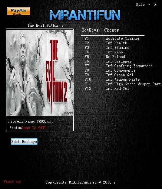恶灵附身2十一项修改器,由MrAntiFun制作,具备无限生命,耐力,弹药,无需再装填,无限注射器,无限制作资源,使用方便简单需要的玩家朋友们可不要错过了哦。【软件特点】