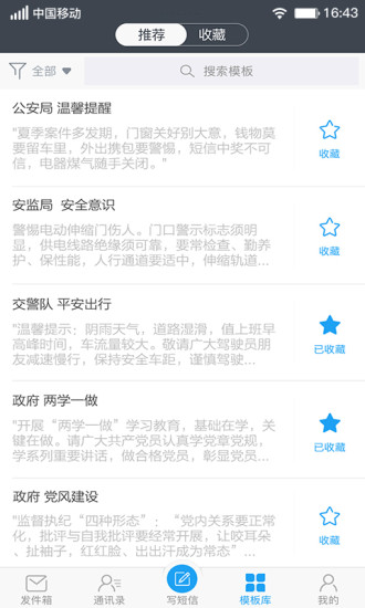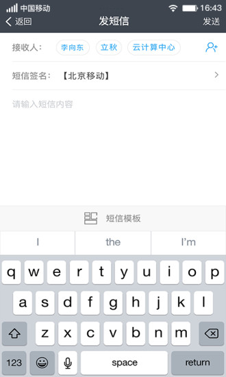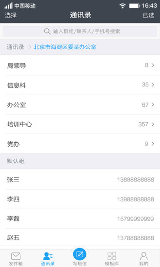 【写短信】界面简洁友好,支持短信签名选择和模板快速导入。【通讯录】层级展示清晰明了,群组选择方便快捷。支持按群组名、单个联系人姓名和手机号的云端搜索。