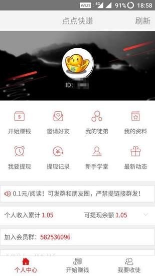 点点快赚赚钱模式:现在新人加入就送1元的新手奖励,文章点击单价0.1元,满10元即可申请提出,提出支持微信提出以及支付宝提出。
