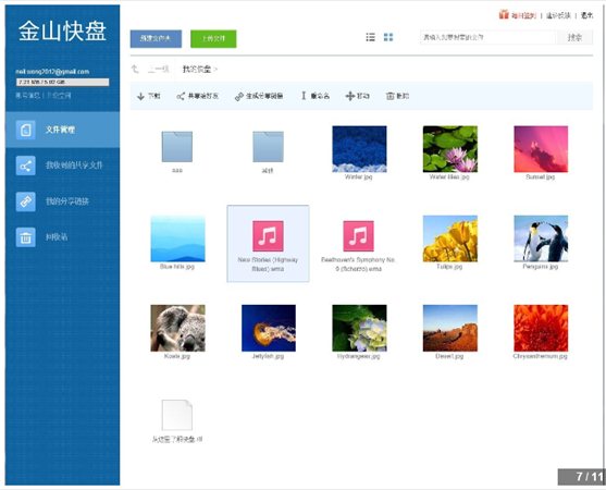 安装快盘客户端后,可以把任意文件丢入指定文件夹,然后就会被同步到该用户其他装有快盘的Windows电脑、Mac电脑、Android手机、iPhone、iPad甚至快盘的官网中。而且还可以设置快盘里的某些文件或文件夹共享给好友,这样以后用户放在这些文件夹里的文件,有任何改动,好友都能立即看到最新版本。用户也可以随时通过登录快盘官网网站去查看快盘里的所有文件。