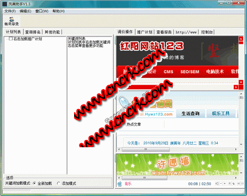 凤巢助手是红阳个人开发的,专业针对百度竞价专业版(凤巢系统)的自助化批量查询排名和快速调价的第三方软件。使用此工具可以实现对百度竞价帐户的管理和控制,软件主要功能有批量查询关键词排名和便捷快速调价。登录百度竞价帐号后可以自动加载帐户中的推广计划,并可手动加载推广单元及关键词;然后通过批量查询排名统计并筛选出各个推广位置的关键词,以便更有针对性的进行调价;再通过便捷快速调价功能对个别关键词进行调价,从而提高对竞价帐户的管理效率、快速高效精准定位关键词排名、大大节省推广人员的时间、提高推广效果。