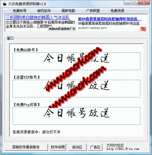 久印免费资源获取器,是久印IT社区推出的实用软件,旨在方便网友网上冲浪,板块分为免费f帐号、装机软件、免费电影、广告联盟和免费资源。是网友上网冲浪的一款实用工具。