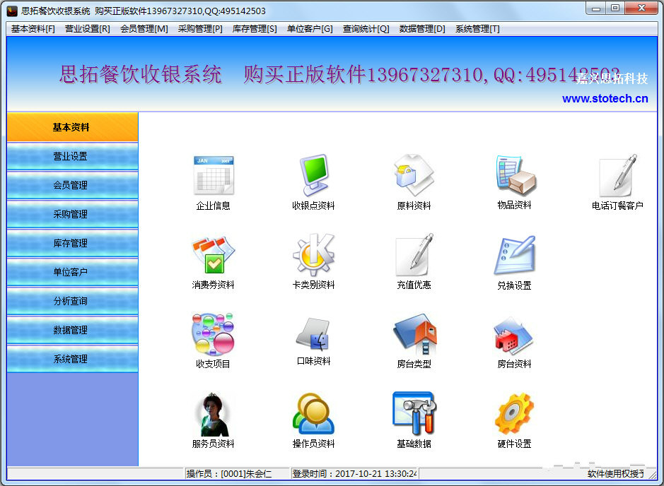 思拓餐饮收银系统是一款实用性很强的餐饮收银软件,适用于大中小型餐饮收银,其主要的模块有:基本资料、营业设置、会员管理、采购管理、库存管理、单位客户、分析查询、数据管理、系统管理,还采用无线网络技术,可以无线点菜,通过具有无线功能的智能化点菜机,服务员可以随时随地为顾客点菜、加菜,并即时把数据分别传到厨房的各打印机上,打印机立刻打印所点的菜单,是您餐饮店收银管理的好帮手,软件用户界面清新自然、让用户享受休闲的美好时光。【功能介绍】