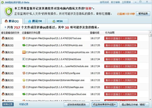 360隐私保护器把QQ.exe对用户电脑中文件的查看如实记录下来,其中标注那些可能涉及用户隐私的文件。也就是说,360隐私保护会告诉用户QQ.exe查看了你电脑中的哪些程序文件,其中哪些文件可能涉及到你的隐私,由用户自行判定QQ是否在侵犯你的个人隐私。
