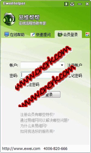 易维帮帮 V2.0.2.0 简体中文官方安装版 易维帮帮是英孚凯尔信息技术有限公司开发的一款基于P2P的远程帮助软件,易维帮帮集即时聊天、文件传输、远程维护,担保支付等多种功能于一体,可以穿透内外网,操作简单,为IT服务商、运营商、企业用户、个人用户等,全面提供安全,便捷的远程PC管理、系统维护、数据安全等IT服务。