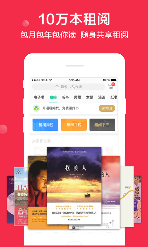 3、当当云阅读“租阅”现已收录超过10万好书,其中TOP 500畅销书占50%以上,让读者以更低价格租更多好书,一次订购,享读就读。
