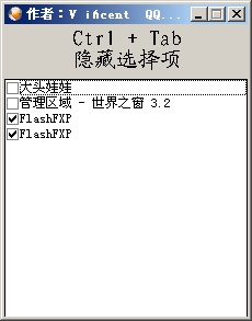 隐藏窗口小工具使用Ctrl+Tab快捷键隐藏/显示选定的窗口(连同隐藏/显示自身)。 F5 刷新窗口列表 F6 全选窗口 F7 取消选择