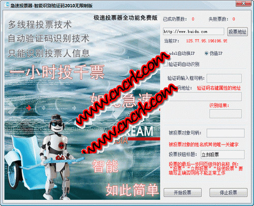 程序采用独特稳定的多线程技术,伪造IP功能可突破大部分投票系统的IP限制.使用伪造IP经测试每分钟可高达42票.