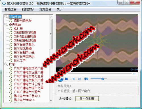 酷火网络收音机 V2.0 简体中文绿色免费版 包括国内多家电台,许多中文电台(中国大陆、港澳台等),以及海外电台。内置了高速收听模块,直接调用WINDOWS系统播放器MEDIAPALYER,以最快速度获取最新数据。为广大广播爱好者、音乐、节目、传统文艺音乐爱好者提供很大的方便。