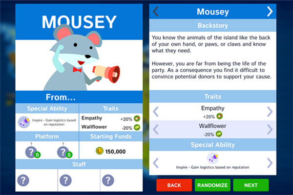 《政坛野兽(Political Animals)》设置在一个虚构的世界,腐败的鳄鱼和经营的小动物们要展开一场政治的较量。在这场政治的较量中,腐败总在不经意间滋生,你能为争取人民的最大利益而斗争吗?你会屈服于贿赂或恐吓吗?你会靠自身魅力赢得选票还是选择收买选票?这一切都由你决定。【配置要求】