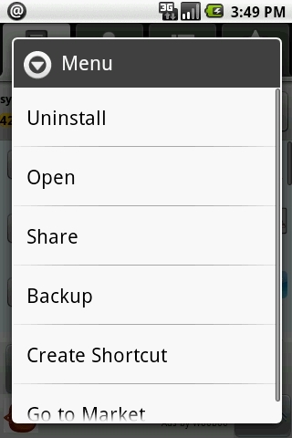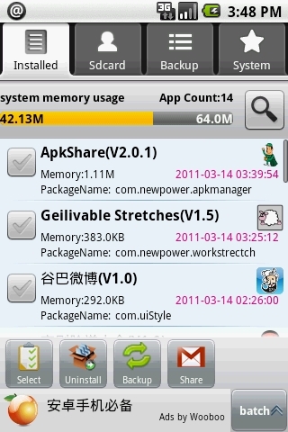备份:支持文件备份。对于SD卡上的APK文件,可以备份后删除备份源,这样可以在同一个位置上管理APK文件。默认是/sdcard/apkshare/backup。