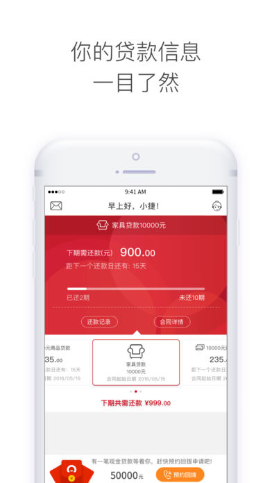 1、我的账户:您在办理贷款时所使用的个人信息、账户信息,一键查询,清晰明了。2、我的贷款:合同状态、贷款本金、分期期数、每期还款额、剩余还款金额、每月还款日,逾期信息等最新的合同详情,最及时的账单信息,随时随地掌握自己的金融状况。