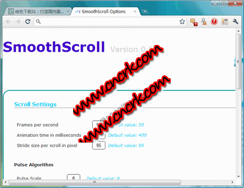 谷歌浏览器平滑滚动插件 V0.6 英文官方安装版 Chrome基于Webkit浏览器引擎运行,而使用Webkit引擎浏览器的一大“特点”是滚动网页时不够平滑,看上去总是有些延迟。这个插件可在Chrome浏览器中实现平滑滚动,安装后,无论你使用鼠标滚轮还是键盘方向键或翻页键,都可以看到平滑滚动效果了