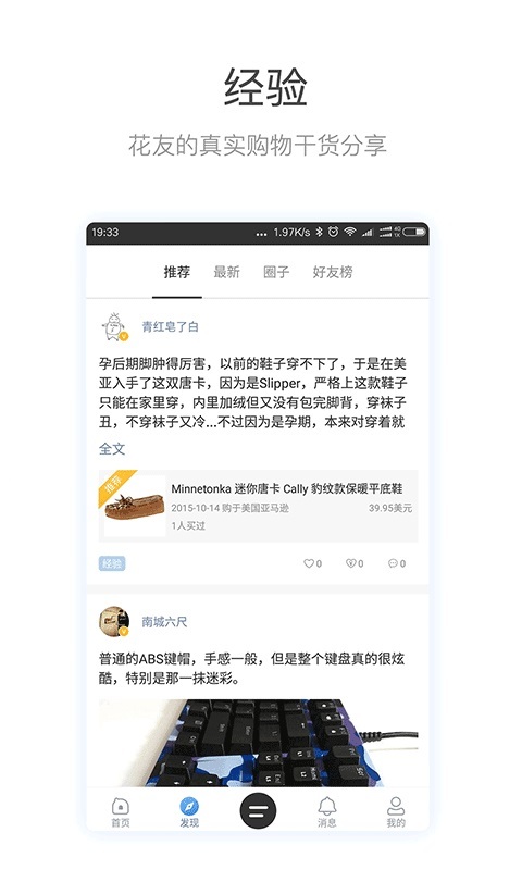 在花记,你可以通过关注达人和好友,实时掌握他们的消费动态,获取经验心得,轻松get什么值得买,根除选择困难症。