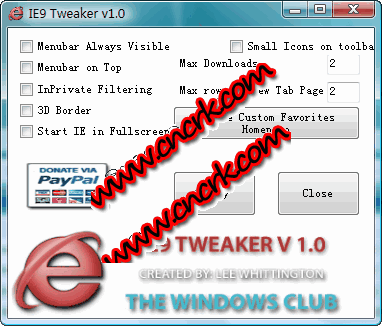 IE9 Tweaker可以按照个人习惯修改IE9浏览器的各种设置,比如设置菜单栏始终可见,开始总是在全屏显示等。