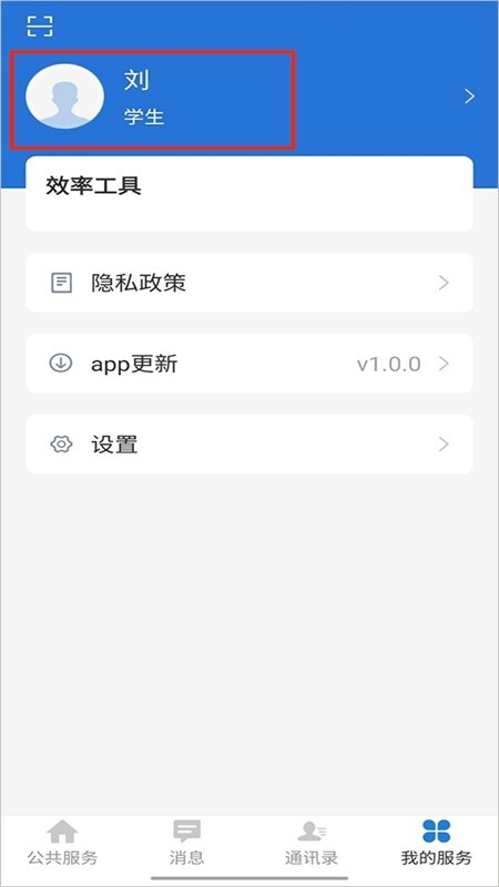 2、点击选择想要进入的身份,以学生身份为例,在“我的服务”顶部的蓝色区域,能够看到所选身份。