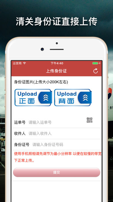 海关身份证文件上传:内置海关身份证文件上传页面让你上传所需文件更方便。