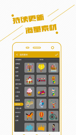【素材库、字体库、颜色库】持续更新的素材库,给你的设计提供原料和内容;字体库囊括百种字体,使你的文字摆脱无聊的一成不变;颜色库提供15套流行色盘,您还可以自定义你想要的色盘。
