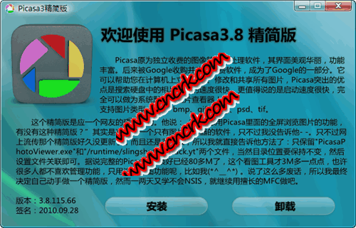 Picasa 3.8 精简版 英文绿色免费版 Picasa原为独立收费的图像管理、处理软件,其界面美观华丽,功能丰富。后来被Google收购并改为免费软件,成为了Google的一部分。它可以帮助您在计算机上立即找到、修改和共享所有图片,Picasa突出的优点是搜索硬盘中的相片图片的速度很快。更值得说的是启动速度很快,完全可以做为系统默认的图片查看器!支持图片类型:jpg、bmp、gif、png、psd、tif。